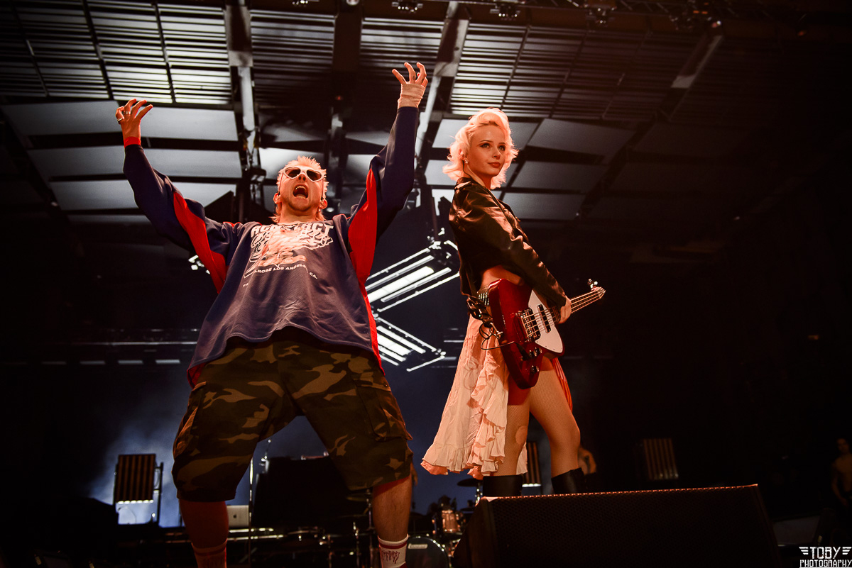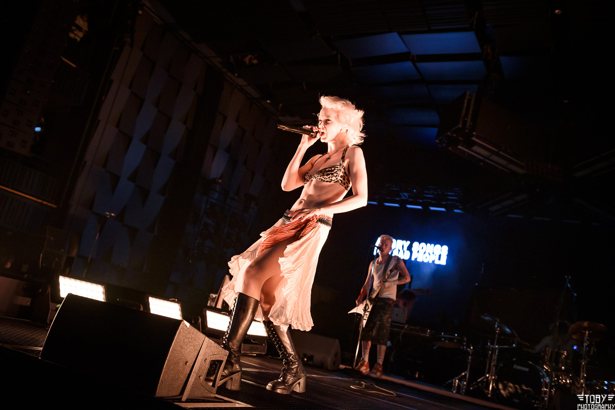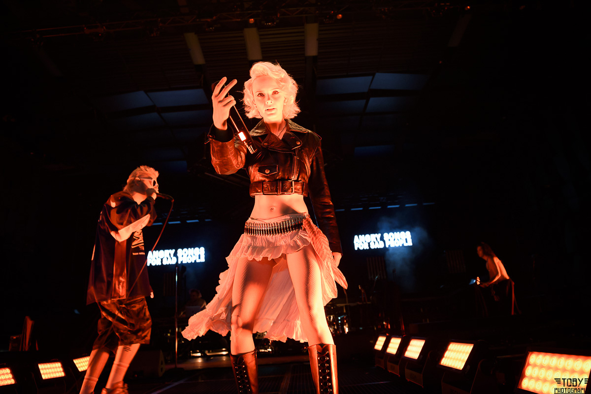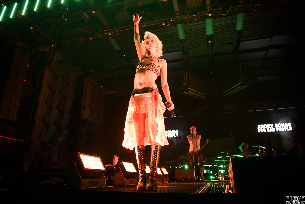 Dveře Fora se otevíraly v šest hodin, a o půl osmé se už mohlo jít na to. Sál již byl z velké části zaplněný, a to včetně obou ochozů. Nad obrovským pódiem se rozsvítil nápis Angry songs for sad people a na potemnělém pódiu se začaly rýsovat obrysy prvních postav této electro-punkové formace.